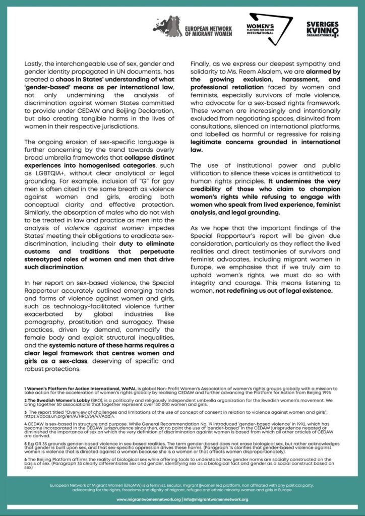 As we hope that the important findings of the Special Rapporteur’s report will be given due consideration, particularly as they reflect the lived realities and direct testimonies of survivors and feminist advocates, including migrant women in Europe, we emphasise that if we truly aim to uphold women’s rights, we must do so with integrity and courage. This means listening to women, not redefining us out of legal existence.
