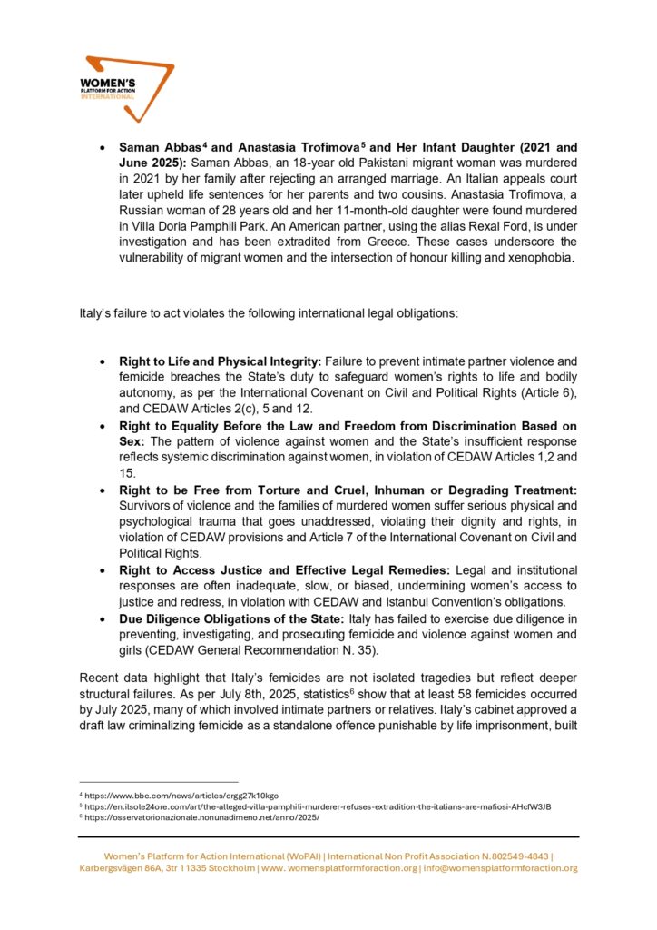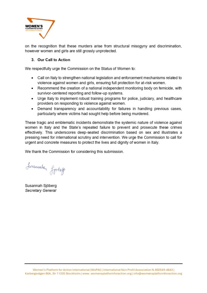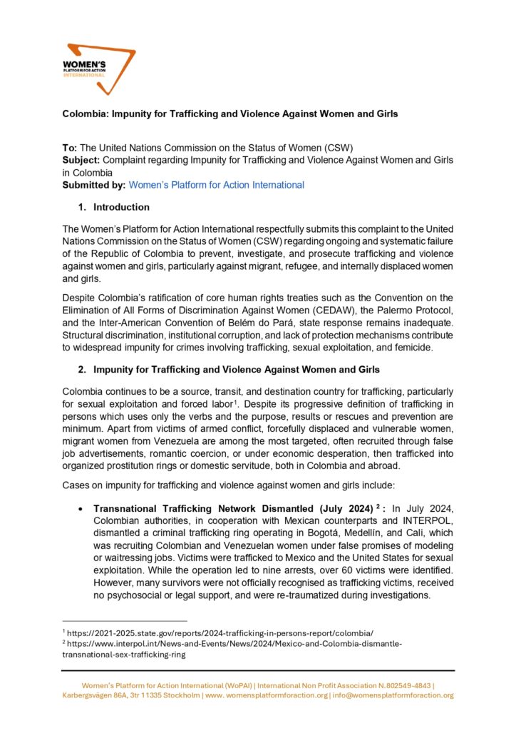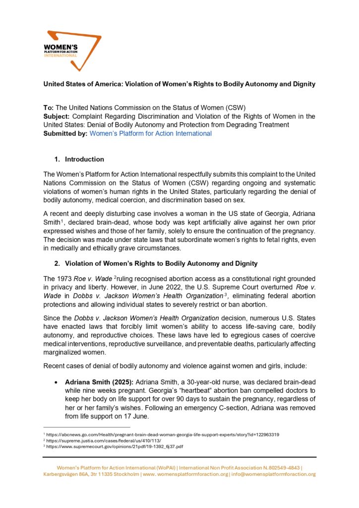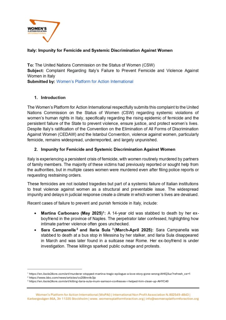 Women’s Platform for Action International (WoPAI) has submitted a communication under the CSW Communications Procedures regarding violations of the human rights of women in six member states: the United States of America, Italy, Australia, Colombia, India and the Democratic Republic of Congo.