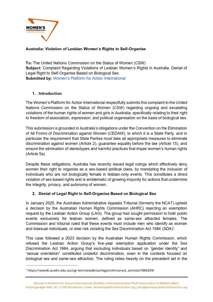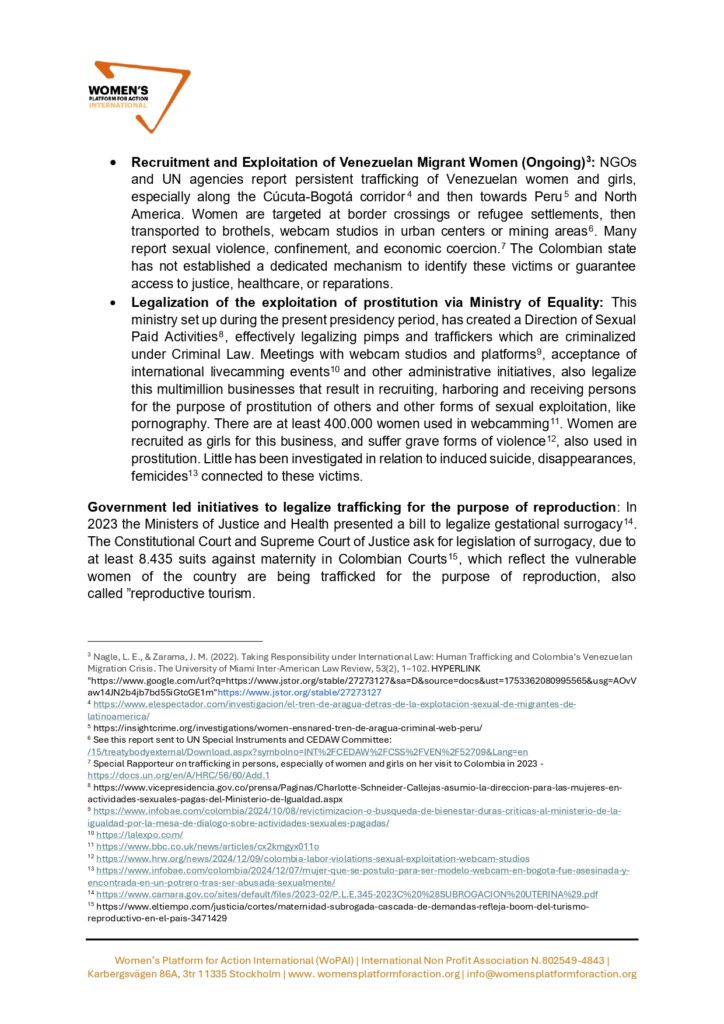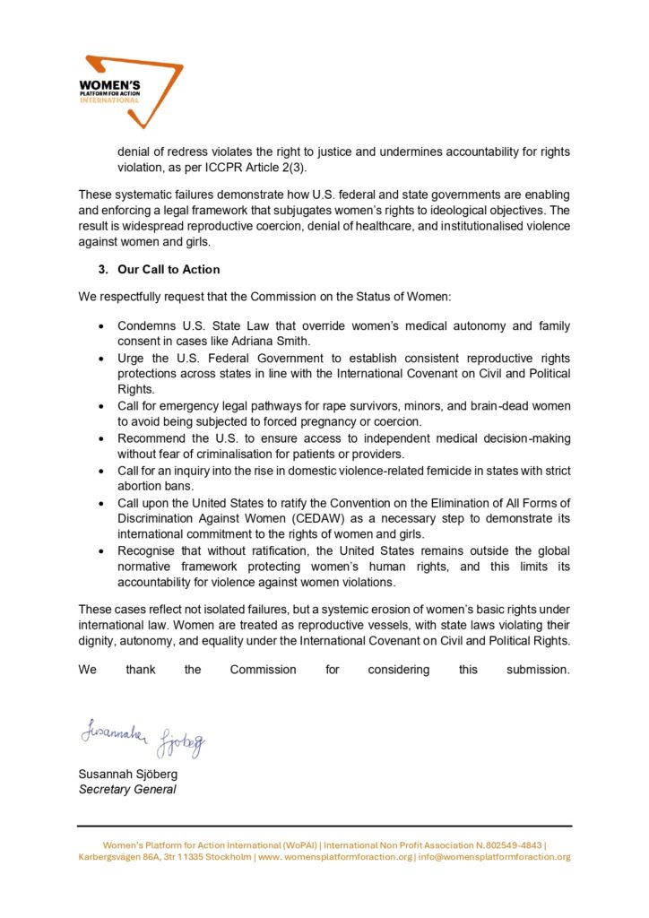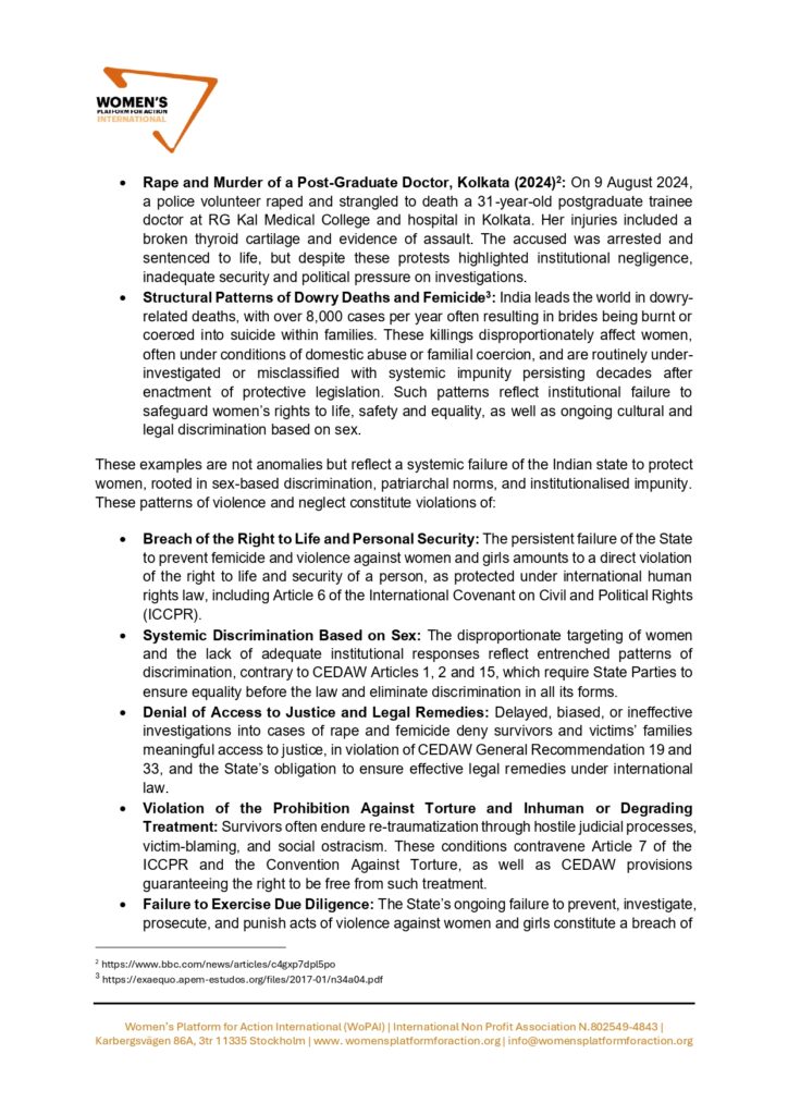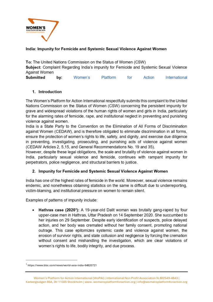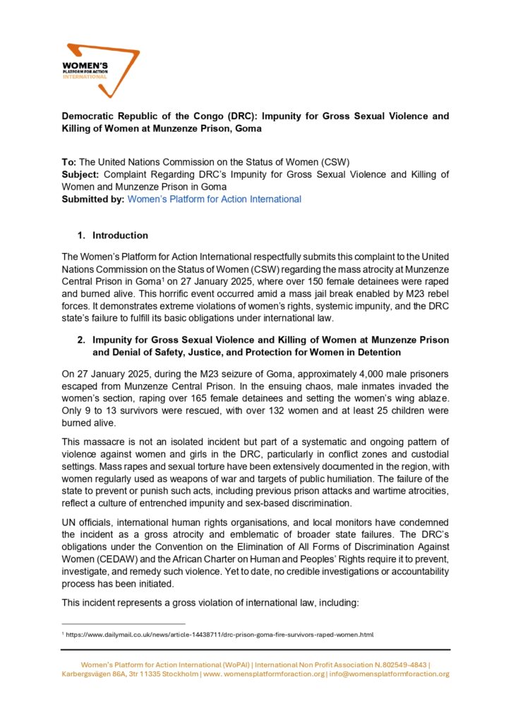 Women’s Platform for Action International (WoPAI) has submitted a communication under the CSW Communications Procedures regarding violations of the human rights of women in six member states: the United States of America, Italy, Australia, Colombia, India and the Democratic Republic of Congo.