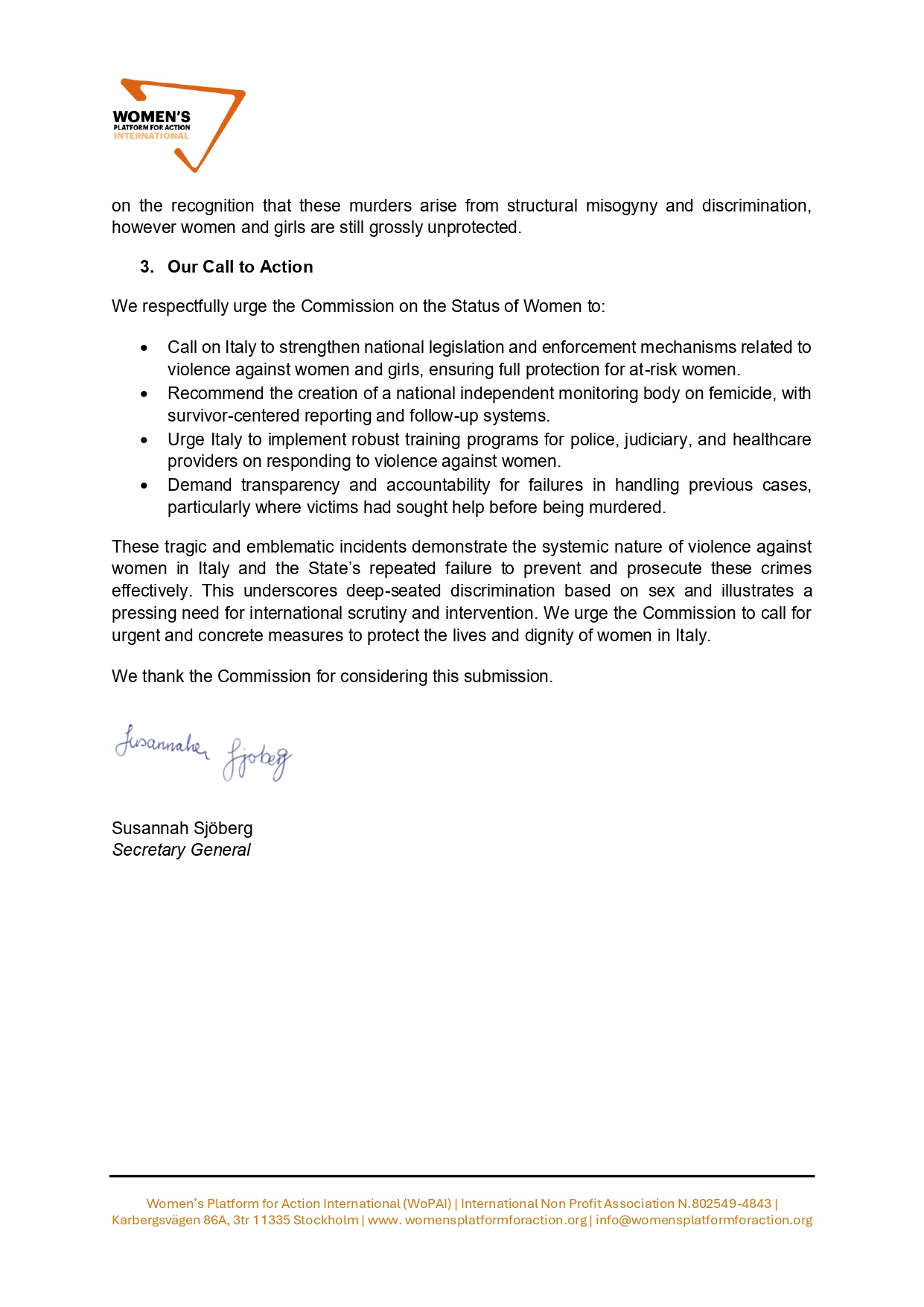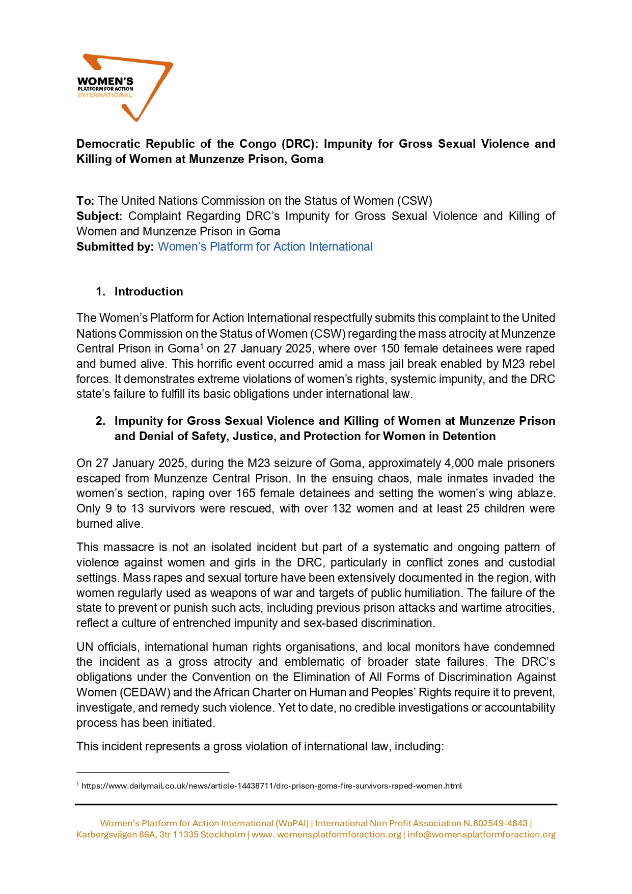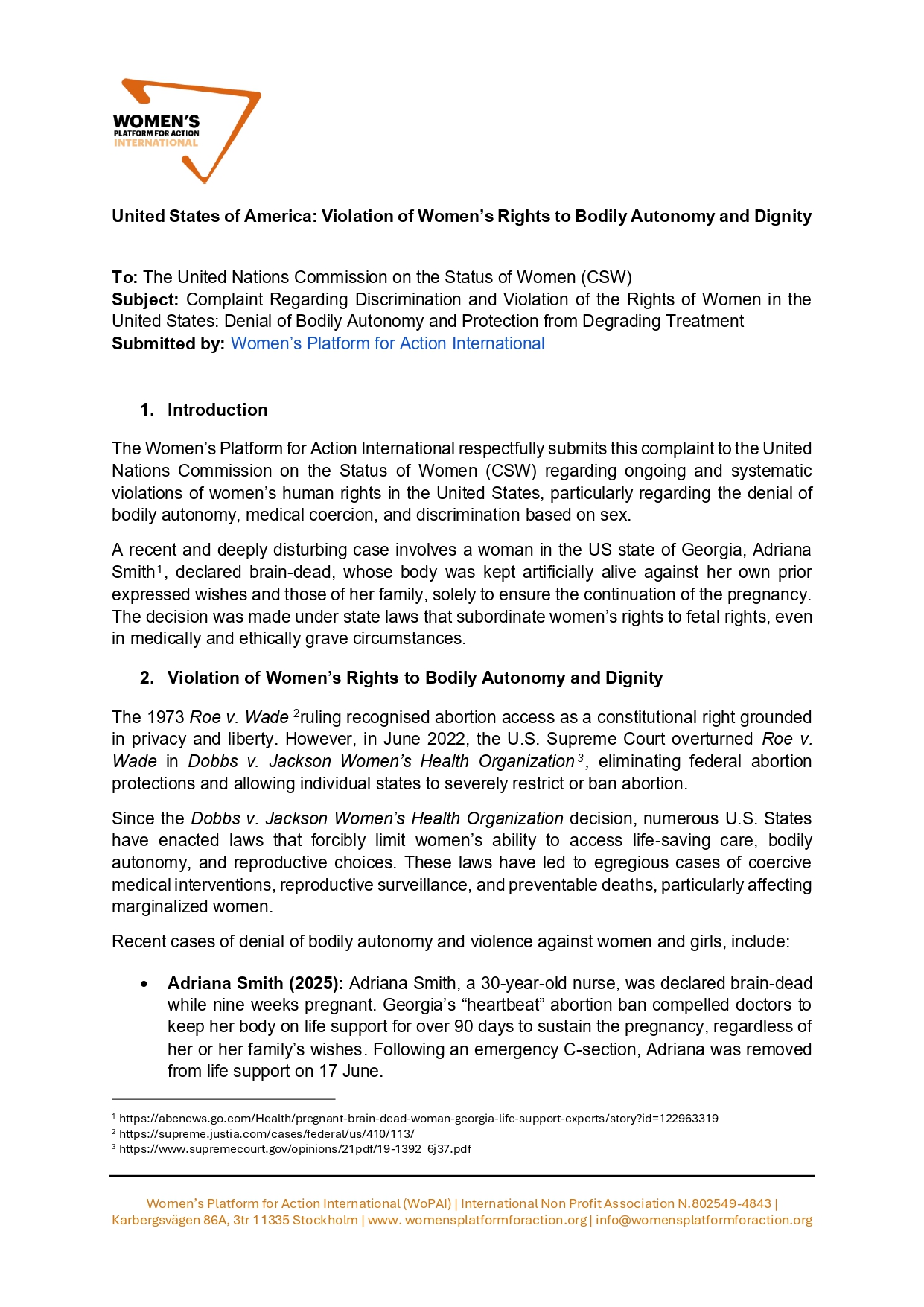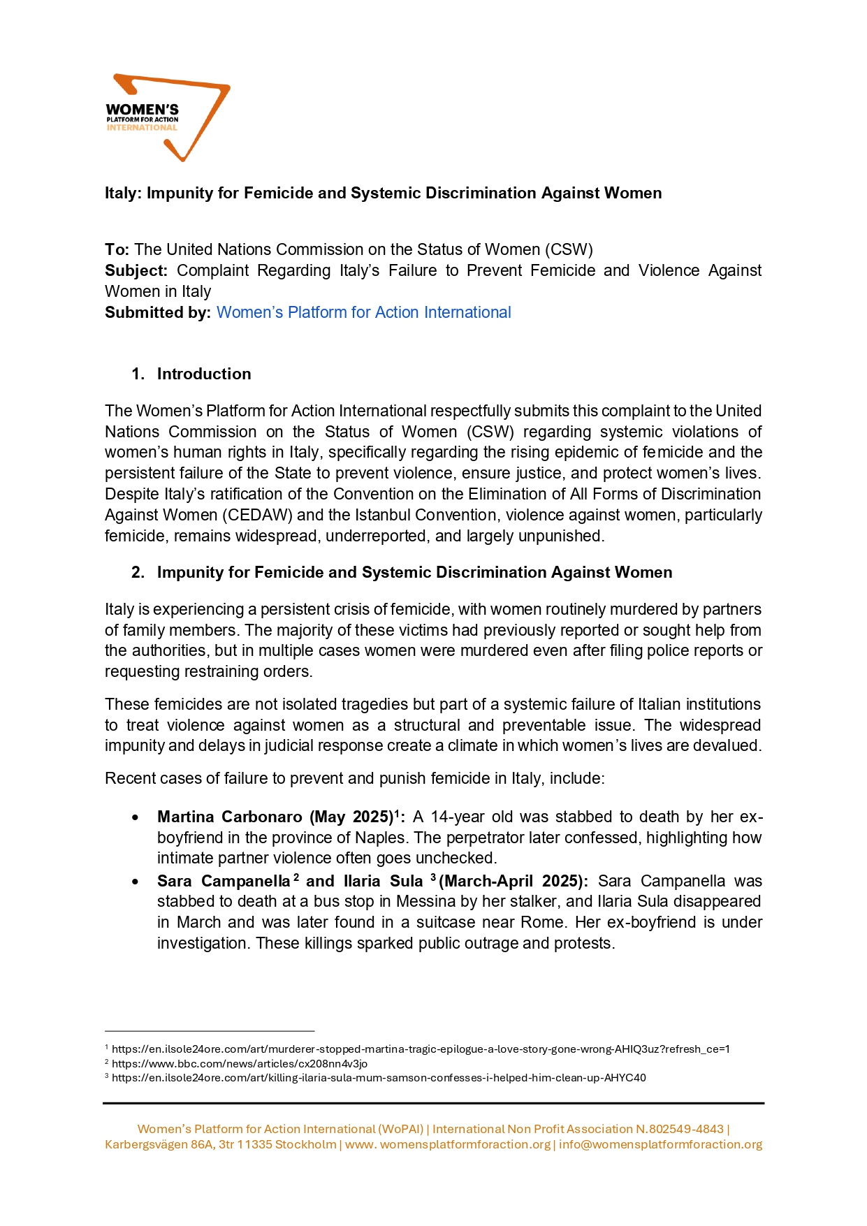 Women’s Platform for Action International (WoPAI) has submitted a communication under the CSW Communications Procedures regarding violations of the human rights of women in six member states: the United States of America, Italy, Australia, Colombia, India and the Democratic Republic of Congo.