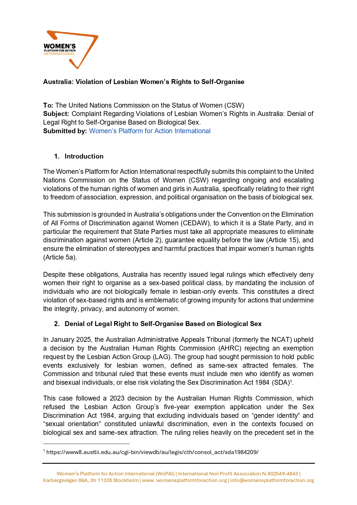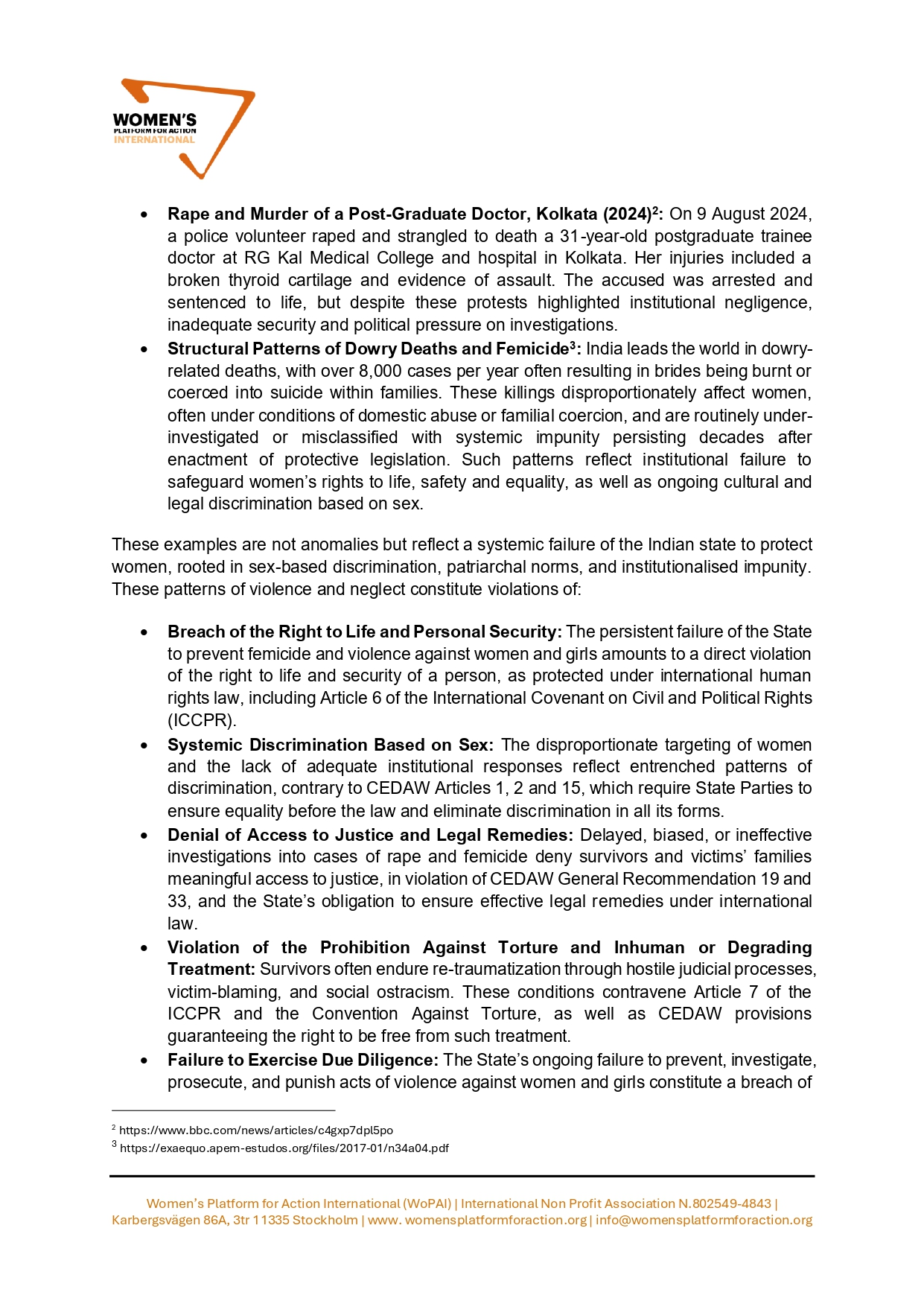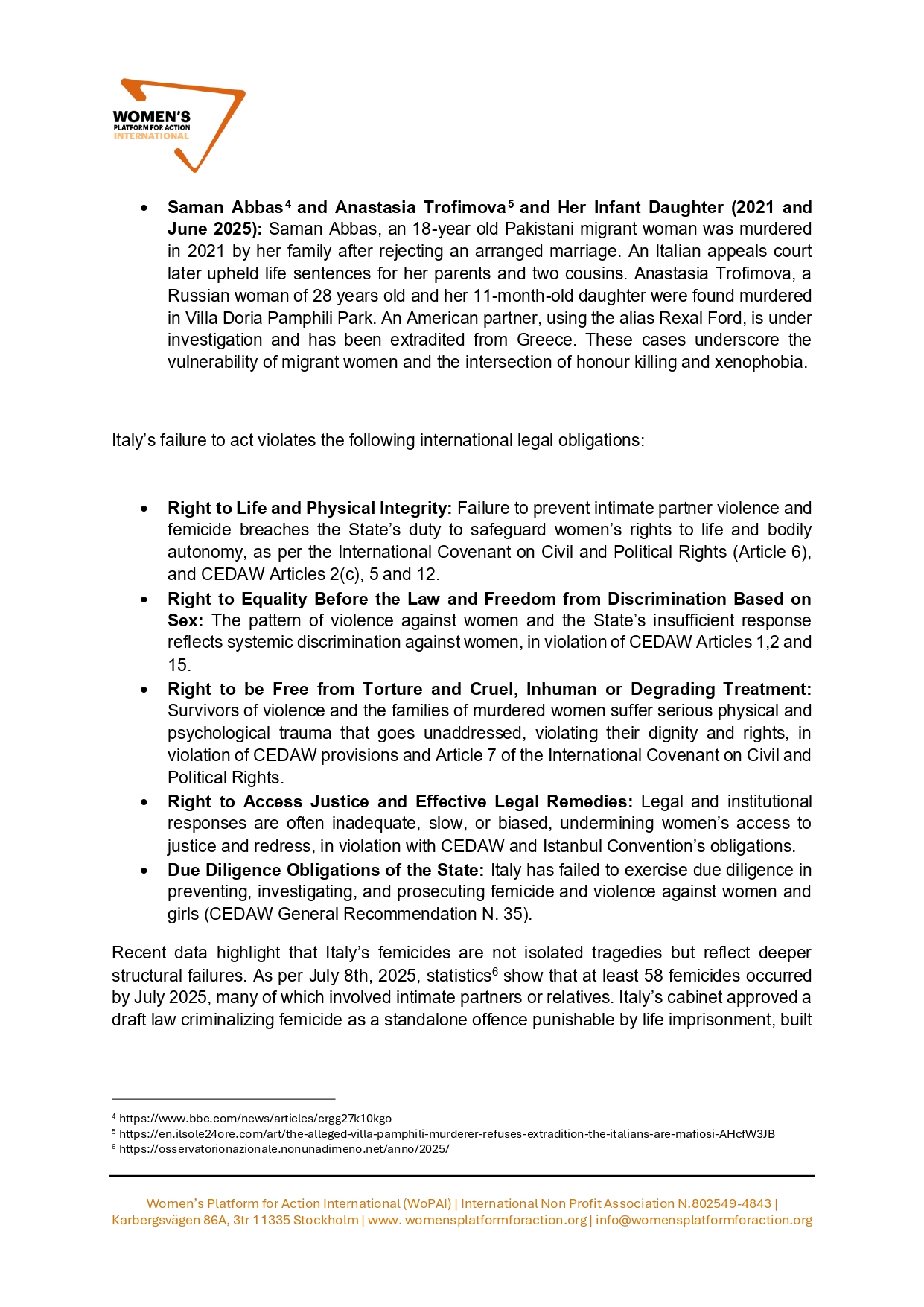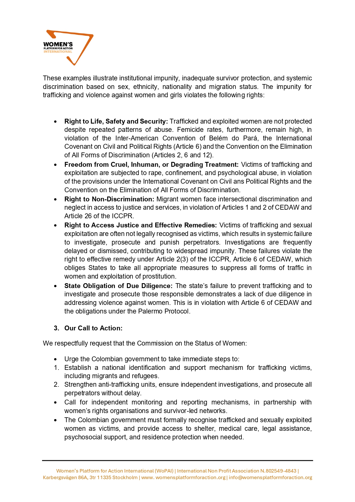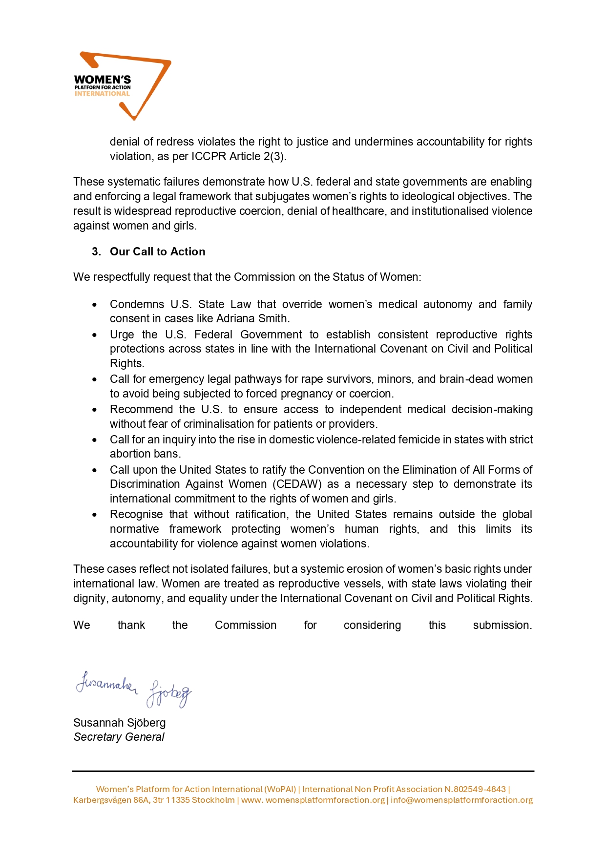 Women’s Platform for Action International (WoPAI) has submitted a communication under the CSW Communications Procedures regarding violations of the human rights of women in six member states: the United States of America, Italy, Australia, Colombia, India and the Democratic Republic of Congo.