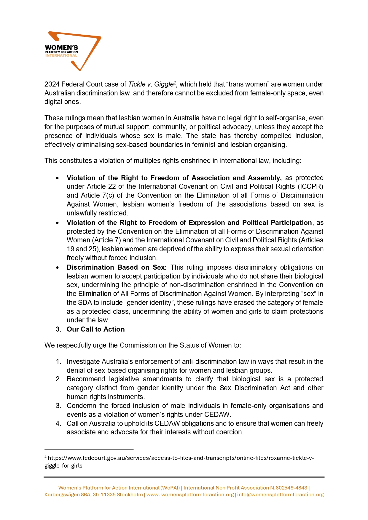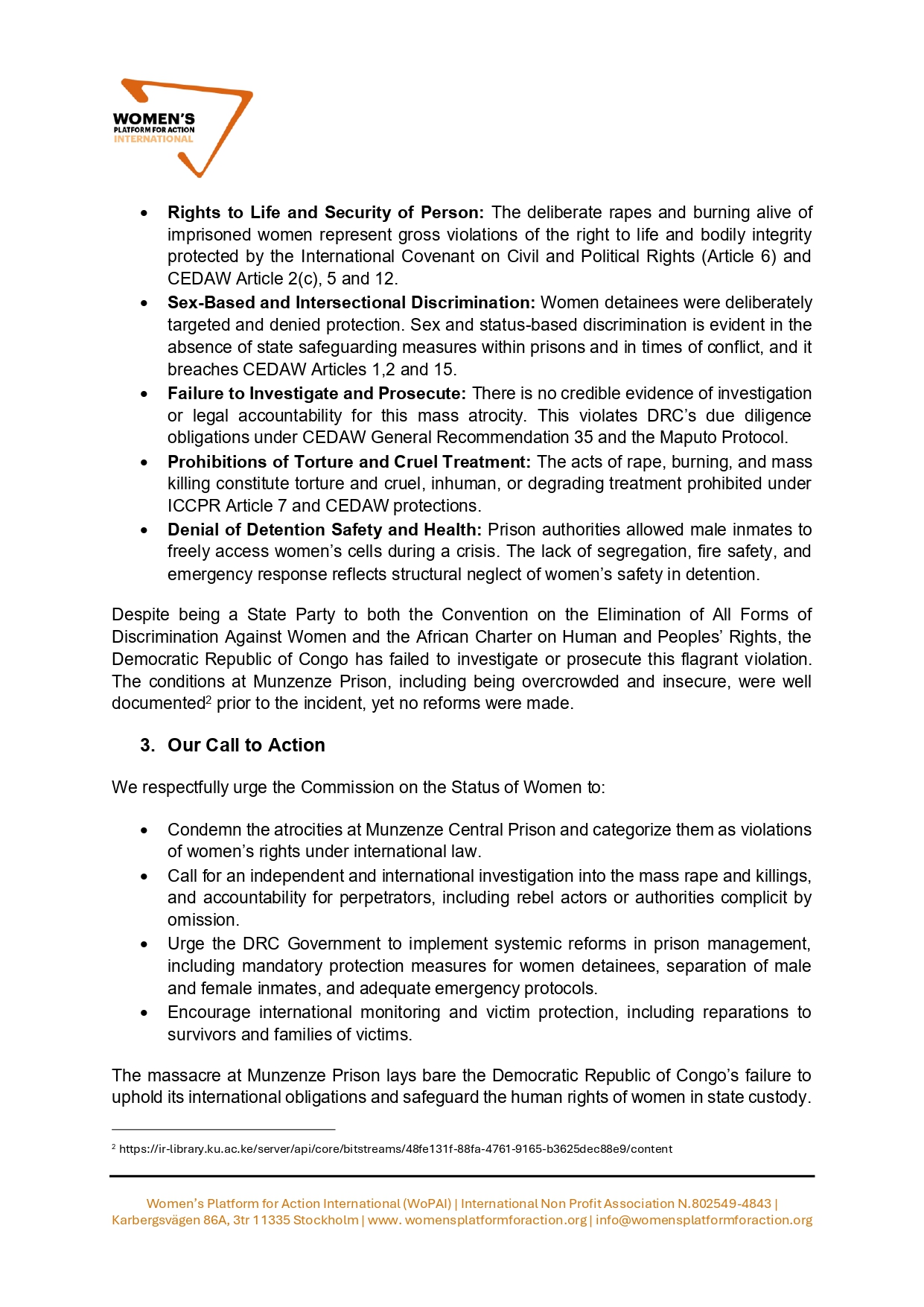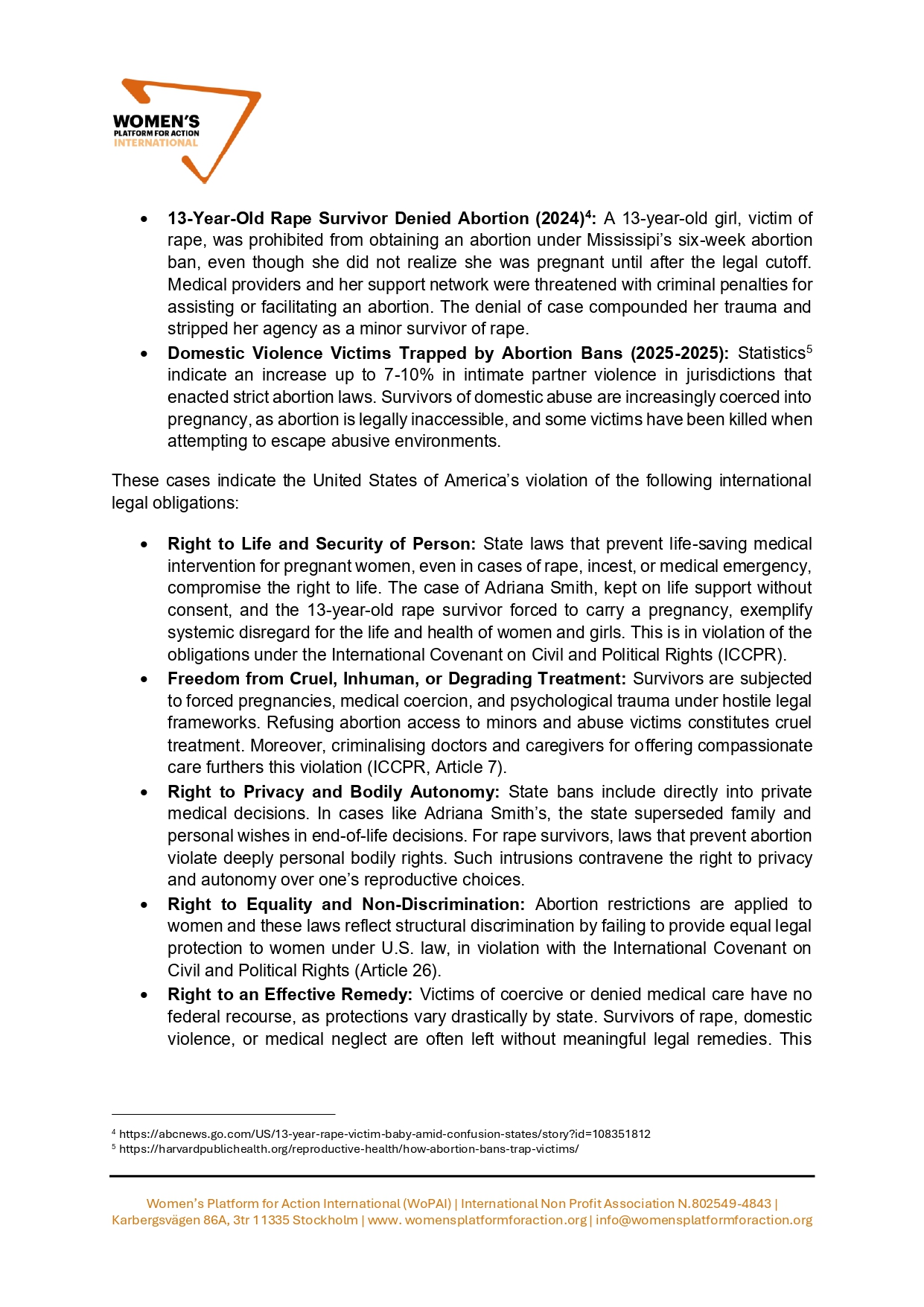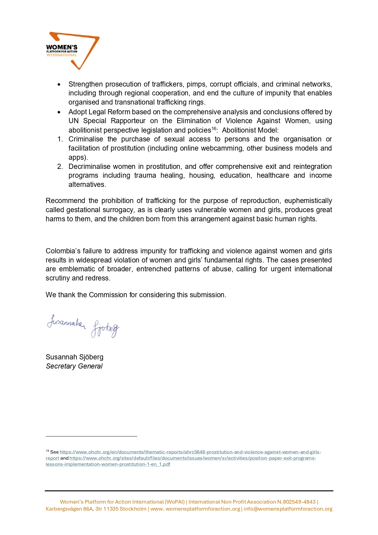 Women’s Platform for Action International (WoPAI) has submitted a communication under the CSW Communications Procedures regarding violations of the human rights of women in six member states: the United States of America, Italy, Australia, Colombia, India and the Democratic Republic of Congo.